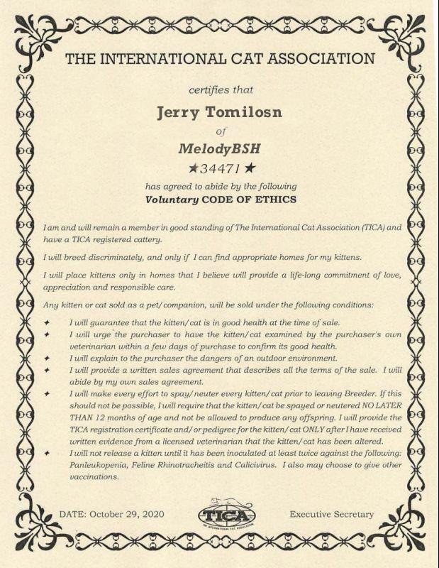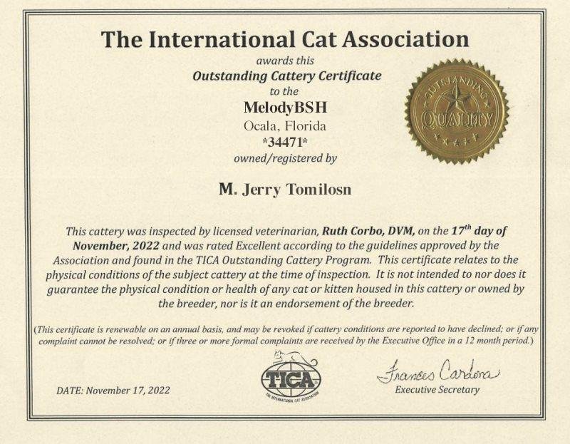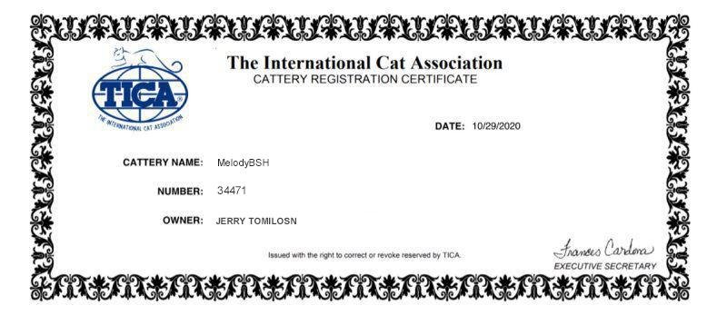 MELODY BRITISH SHORTHAIR CATTERY is a family of reputable, home-based breeder specializing in British Shorthair. Registered with prestigious organizations such as The International Cat Association (TICA) & Cat Fanciers’ Association (CFA) , we operate under the name MelodyBSH with both organization. Feel free to explore our website to view our official registration certificates.