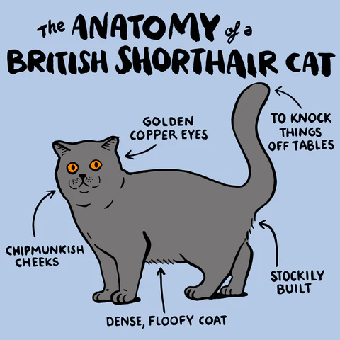 The British Shorthair is a large, muscular cat with a broad chest, strong shoulders, and a solid back. Their legs are short and thick, with rounded paws and a medium-length, thick tail that reaches at least to the shoulders. The neck is short and strong, contributing to their overall sturdy appearance.